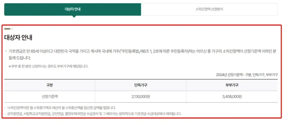 2024년 기준으로 단독가구의 선정기준액은 2,130,000원, 부부가구는 3,408,000원입니다