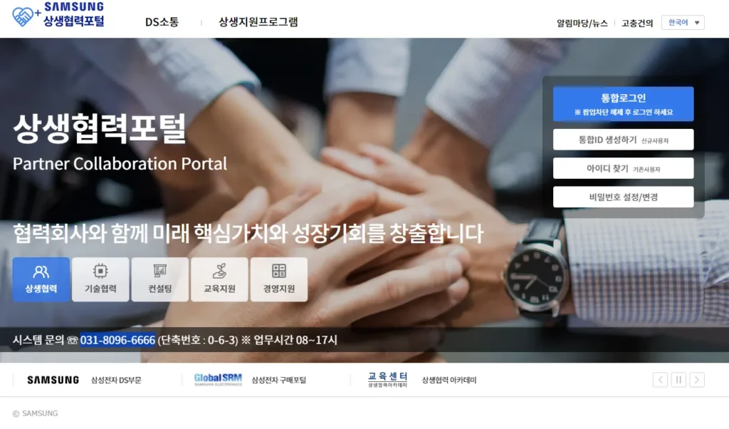 삼성전자 DS부문 상생협력포털에 대한 문의는 포털 홈페이지 또는 전화(031-8096-6666)를 통해 가능합니다.