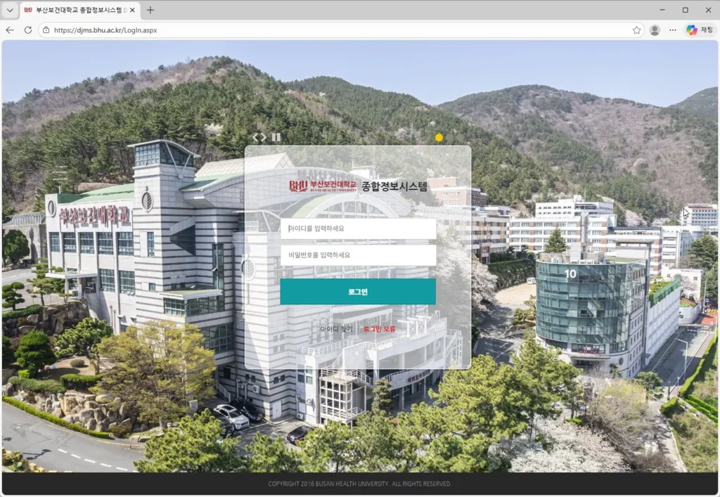 보건 의료 전문가를 꿈꾸며 열정을 불태우는 부산보건대학교 학생 여러분, 그리고 원활한 학사 행정을 위해 애쓰시는 교직원분들께 종합정보시스템(djms.bhu.ac.kr)은 하루에도 몇 번씩 드나드는 디지털 캠퍼스의 정문과 같습니다.
