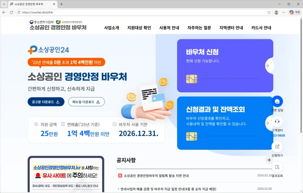 연 매출 1억 400만 원 미만 소상공인이라면 2월 9일부터 시작된 홀짝제 일정에 맞춰 전용 홈페이지에서 25만 원 바우처를 신청하시면 됩니다.