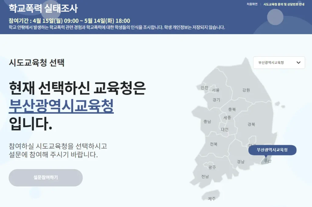 - 실태조사 사이트 접속: 실태조사 사이트에 접속 후 소속된 학교의 시·도교육청 선택해주세요.